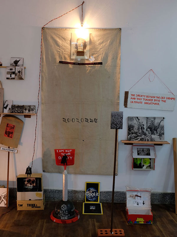 Drinking glass, water, cloth, bubble paper, Xerox print, college, text, Photograph, books, shoe boxes, bulbs, paper bag, army helmet, plastic hands, coca cola bottle case, toys, brick, wood stands, paper stands, glasses, cardboard, dustpan, wood, ted beret cap, 2 piece CRT television, 1 piece 6 inc TV, found image, found video footage